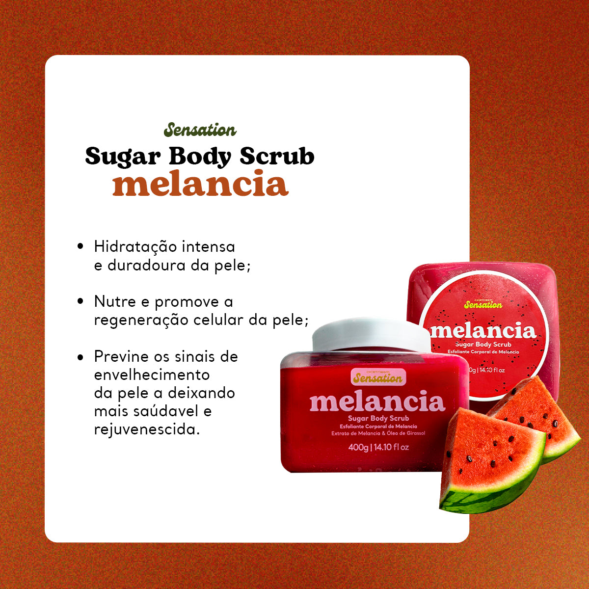 O Esfoliante Corporal Melancia Sensation remove células mortas, hidrata e revitaliza profundamente. O extrato de melancia, com propriedades hidratantes e antioxidantes, mantém a pele fresca e radiante. O óleo de girassol, rico em vitamina E, nutre, suaviza e melhora a elasticidade, deixando a pele macia e rejuvenescida.